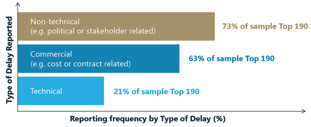A study of the top 190 oil and gas projects around the world revealed that there was an average delay of 12 months for non-producing fields – 73% of these project delays were attributed to non-technical issues, including political or stakeholder related issues.1
